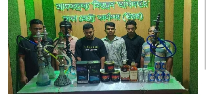 রোববার (১২ অক্টোবর) গণমাধ্যমে পাঠানো এক সংবাদ বিজ্ঞপ্তিতে এ তথ্য জানান ডিএনসির ঢাকা মেট্রো উত্তর কার্যালয়ের উপ-পরিচালক শামীম আহম্মেদতিনি জানান, শনিবার (১১ অক্টোবর) গুলশানের মনটানা লাউঞ্জ এবং বনানীর দ্য সিলভার লাউঞ্জ, সেলসিয়াস, এক্সটিক ও ইউনিক রিজেন্সী হোটেলে অভিযান পরিচালনা করা হয়। এর মধ্যে মনটানা লাউঞ্জ থেকে ৩ কেজি অবৈধ শিসা, ৫টি সিসা সেবনের হুক্কা, ২ লিটার বিদেশি মদ, ১২ ক্যান বিয়ার ও সিসা বিক্রির ১২ হাজার ৮৭০ টাকাসহ ৬ জনকে গ্রেপ্তার করা হয়।এ সময় আরও দুইজন পালিয়ে যান।